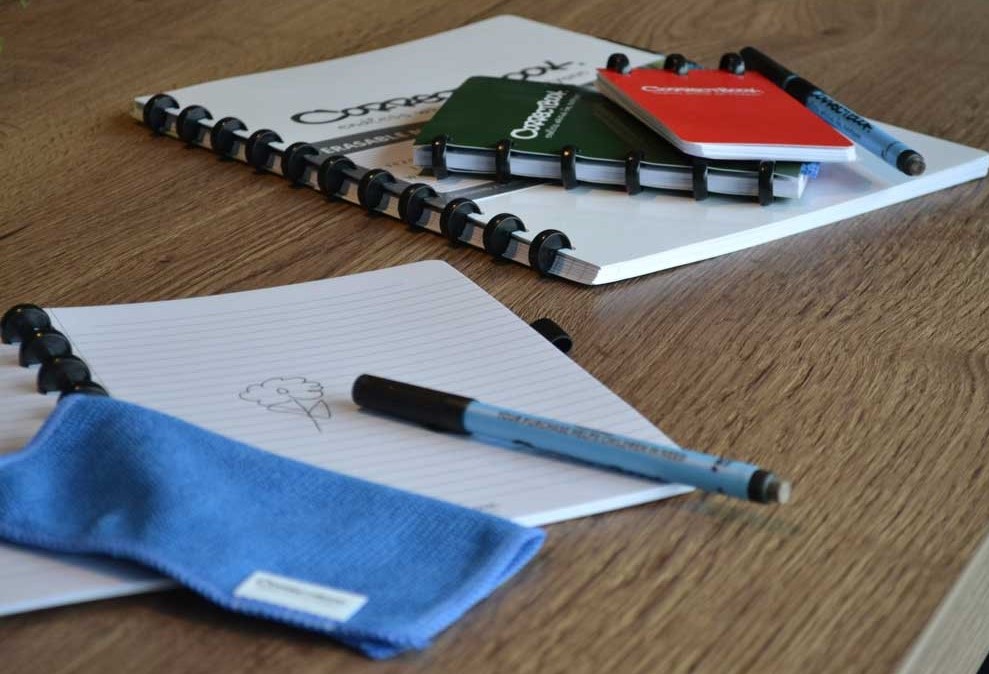 Un Correctbook n’est pas un carnet ordinaire. Les pages sont fabriquées en papier spécial effaçable qui fonctionne comme un tableau blanc. Vous écrivez avec le marqueur fourni, vous scannez vos notes via l’application Correctbook, puis vous les effacez facilement avec un chiffon ou l’effaceur. Ainsi, vous disposez toujours d’un carnet comme neuf, sans jamais devoir acheter de nouvelles pages. Comme vous pouvez réutiliser le carnet encore et encore, vous économisez non seulement de l’argent, mais aussi beaucoup de papier.
