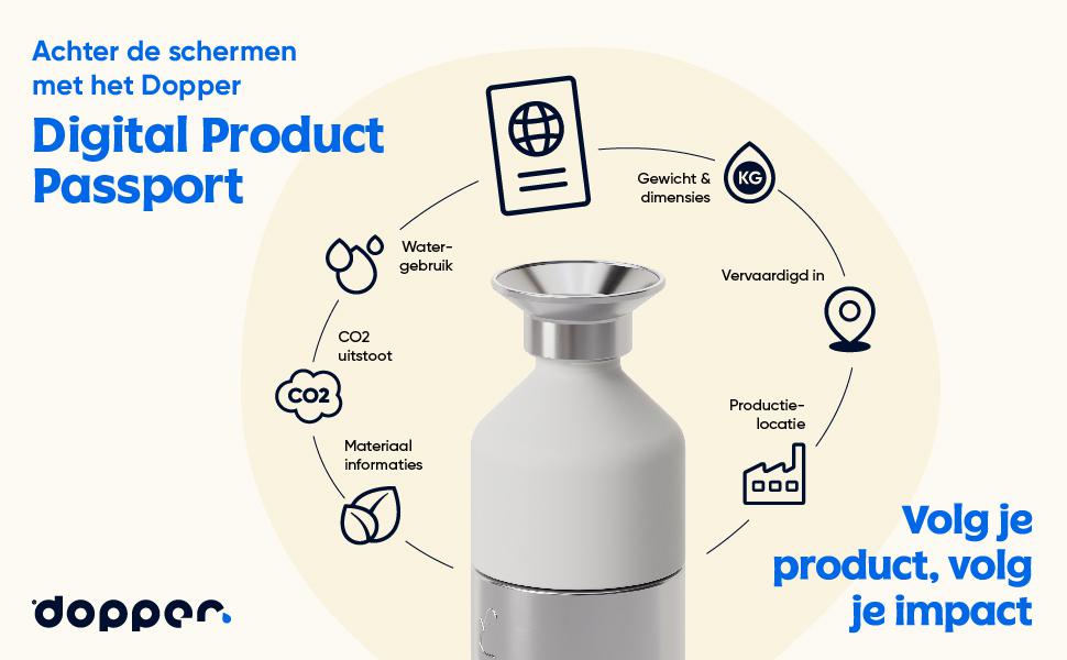 En avril 2024, Dopper a lancé le Passeport Produit Numérique (DPP). Grâce à ce DPP, vous pouvez suivre l’ensemble du parcours de votre produit : de la production à la livraison, jusqu’à la fin de son cycle de vie. Parmi les informations clés figurant dans le DPP : l’origine des matériaux, l’empreinte environnementale du produit et les consignes d’entretien. Le DPP démontre que la durabilité est une priorité, et confirme l’engagement de Dopper à ouvrir la voie vers une économie circulaire.