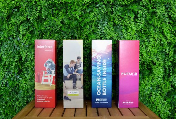- La boîte Dopper est un élégant écrin pour offrir la bouteille. Cet emballage cadeau haut de gamme peut être personnalisé avec votre propre design.
